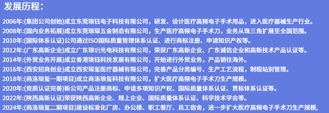 公司在原有的基礎上成立了東莞市瑯琛電子五金有限公司和香港瑯鈺科技發展有限公司,專業生產經營醫療高頻電子手術用品:醫用手術刀、高頻電極、消融電極、高頻電刀、高頻利普刀、微創手術刀、雙極電凝鑷、雙極電凝鉗等。我們對于醫療高頻電子手術用品的精密配件加工,以及半成品和成品的生產已經形成了完整配套的設施:產品研發生產、五金數控機加、精密五金制造、配件表面處理、塑膠成型加工、產品裝配包裝、模具設計制造的生產單位和管理團隊等。